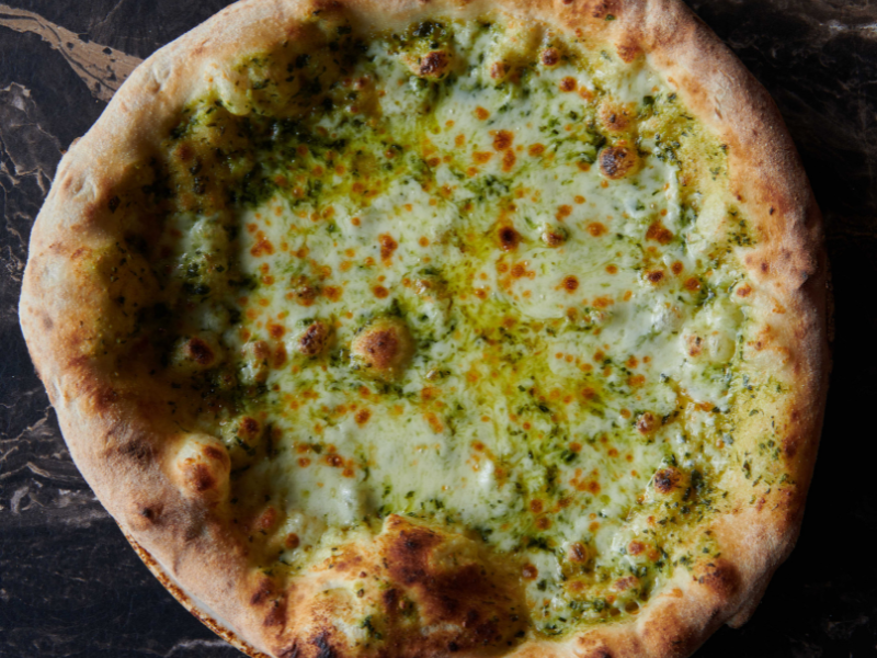 Tomate, Mozzarella, Jamón Crudo, Parmesano, Pesto
