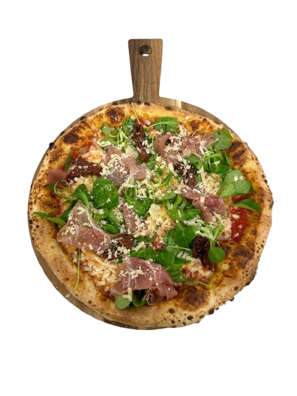 Tomate, Mozzarella, Jamon San Daniele, Rucula, Lascas De Parmesano, Tomates Secos